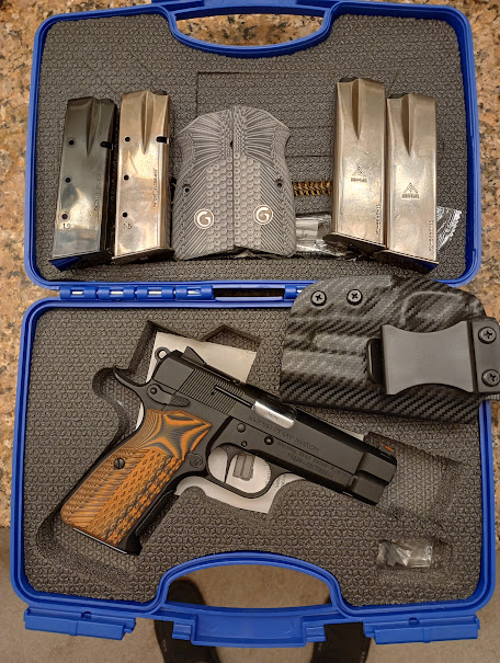 Up for sale or trade is my Girsan P35 PI LW Match 9mm. This is like a commander size model with the aluminum frame. Love it but doesn't fit my hand well. Maybe 250 rounds through it. Has a 32 pound hammer spring and C&S hard chrome sear to reduce the trigger pull about a pound. Factory parts are in the box. Comes with the G10 grips on it and the factory G10 grips. 5 Mecgar 15 round mags. 2 factory blued and 3 SS. Rear sight comes off to access the RMSc pattern direct mount. I had a Holosun 407k on it. Also throwing in a commander size IWB holster that works with the red dot installed.