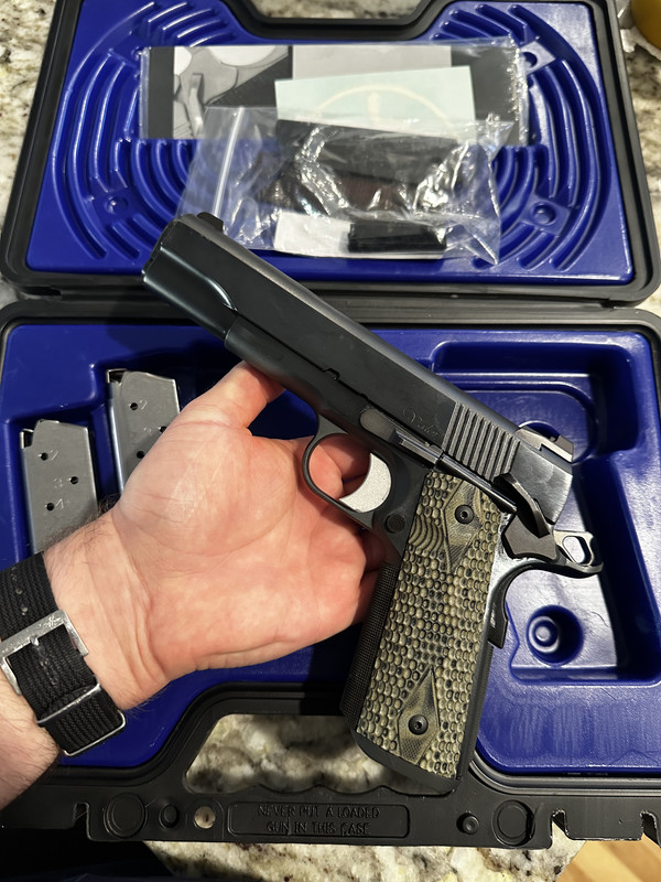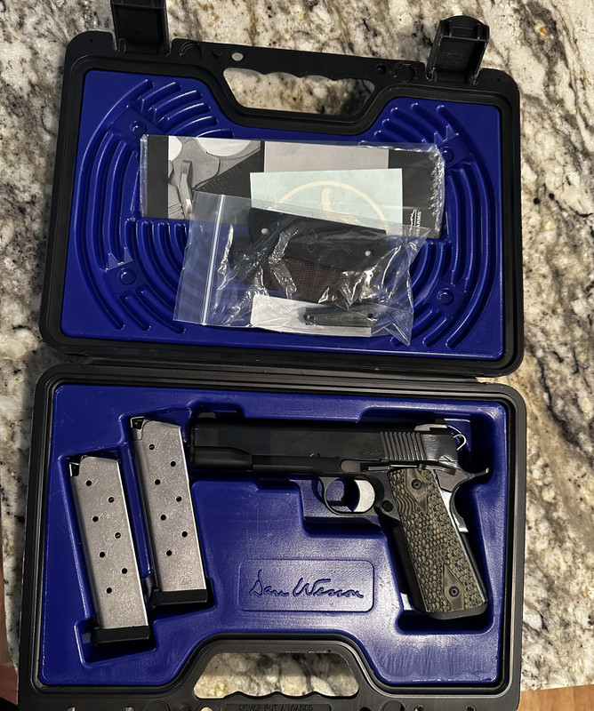 For sale is a Dan Wesson Valor, 5" in .45ACP. The gun is finished in polished blueing, which Dan Wesson only offered for a limited window. Called the factory and inquired, this pistol was manufactured in February of 2017. Many collectors consider this rare pistol from the golden era of DW production. Has a Nighthawk one-piece magwell, and VZ grips (standard thickness) installed. Has a brand new 18lbs Sprinco recoil spring as well. Includes the original MSH and grips. Please note, the original factory grips are VZ slim grips, which will require different grip screw bushings to use. Also includes factory case, factory 2 magazines and all associated material. Pistol is in overall great shape. Has some minor finish wear from holstering and general use. I am not the original owner, so do not know the total round count. I have fired less than 200 rounds through it. Overall in great shape, with beautiful finish. Selling to fund other projects. Price is $2,200. Not interested in trades at this time. VA DL, CHP, and bill of sale. Or we can go to an FFL (in NoVA, prefer Sharpshooters, SEG, NoVA Armory).