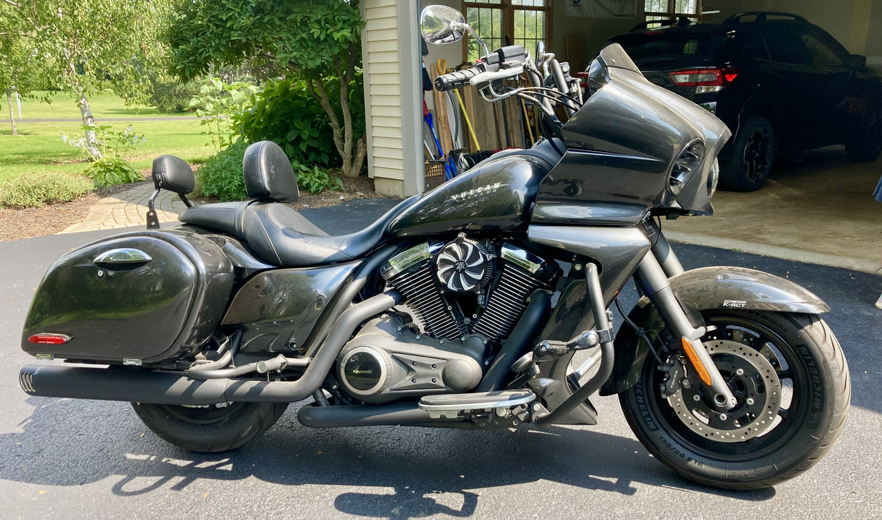 Metallic Carbon Gray with black racing stripe, 7727 miles (maybe a couple more but less than 7900) Four-stroke, liquid-cooled, 1700cc V-twin Bagger Blacked out engine, chassis, handlebars, exhaust; Six-speed with overdrive Michelin Commander III tires, like new AM/FM/WB audio system with iPod® and SiriusXM® radio compatibility; aftermarket speakers and amplifier 14” Mini ape handlebars Driver and Passenger Backrests LED lighting front and rear (headlamp, taillamp, turn signals) K-ACT II ABS braking system and Electronic cruise control Freedom Performance True Duals exhaust and Big Air Kit (loud, torque-y) ECU has been ‘Ivanized’ (flashed), tons of torque Never dropped, always garaged, very low miles. Price $7,900. Would consider trade (+/- cash) towards gold/silver, 23'-26' bow rider boat or 26-28' RV that sleeps at least 7 and weighs less than 6000 lbs.. 2015 Kawasaki Vulcan Vaquero, excellent condition, low miles https://i.postimg.cc/hv5nrtLh/IMG_3922.jpg