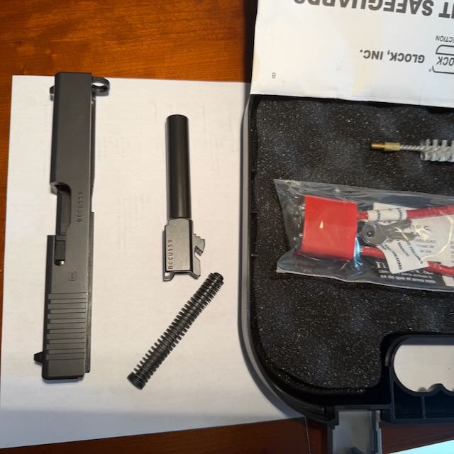 Hi, Pristine OEM G19 G3 slide/barrel/spring assembly with 50 rds through it. Comes with tupperware/lock as displayed in picture. Also includes Glock OEM lower parts kit as shown with extended slide release Note - rear sight white outline blacked out (sharpie) $275 cash takes all and at this price not interested in splitting pieces. Meet Greentop or West-End Cabelas