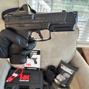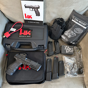 Up for sale is a lightly used HK with the Damascus slide option. Pistol comes with the following. Upgrades: Lazy Wolf trigger kit w/red shoe, DPM recoil rod & springs, red & green iron sights, HK Parts Mod 1 Compensator, 17 rd mag conversion kit, Gen 2 enhanced mag release. Additional Items that come with the pistol: 22rd, 20rd, 17rd, 15rd, (2) 12rd’s magazines, MVP Holster, blade tech quick connect mount, Swampfox Justice red dot, box, hard case, soft case, paperwork, cable lock and any original parts. $1,300 and agree to bill of sale or Outdoor Arms transfer.